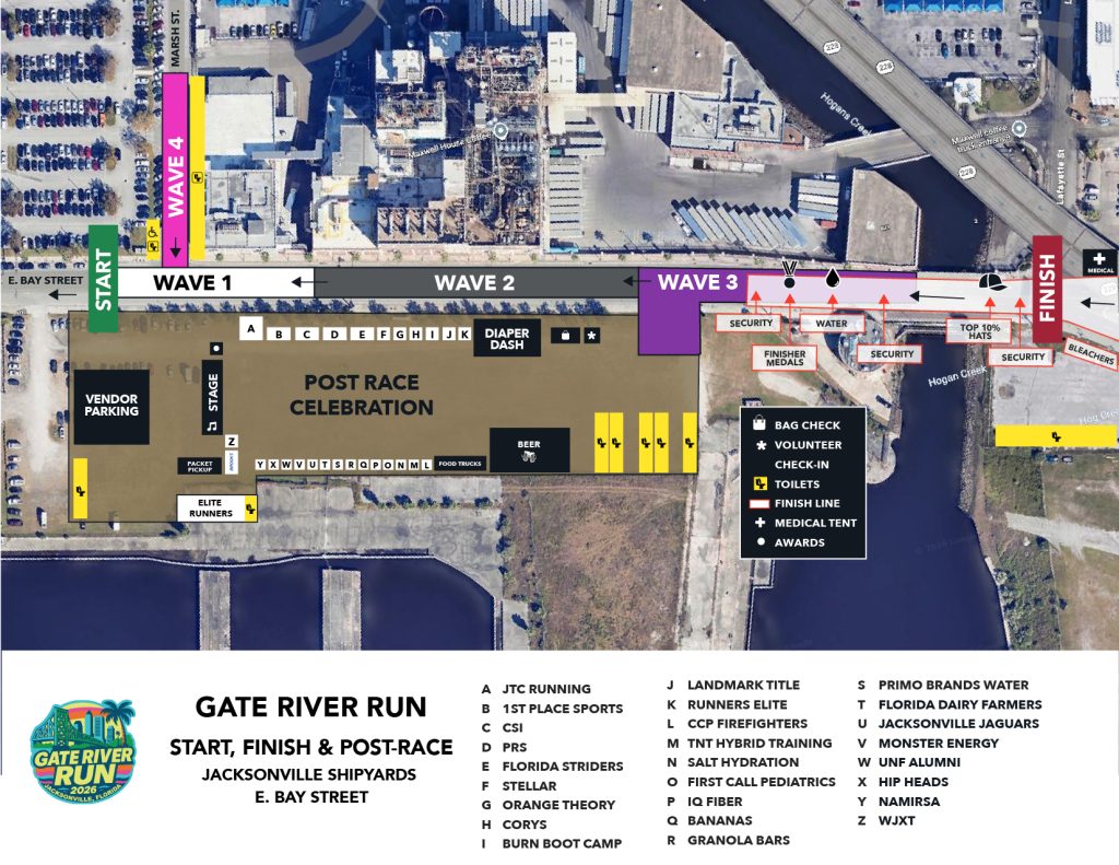 Please arrive early to allow time to park and get to your Wave Staging Area. Start/Finish Location Update: We have moved the start and finish to the Jacksonville Shipyards (700 E. Bay Street) due to ongoing construction at the stadium. To accommodate the new start/finish, Bay Street will be closed east of the Main Street Bridge. There is absolutely no parking at the Jacksonville Shipyards. Plan to park off-site and walk or use shuttle transportation.Arriving & Parking