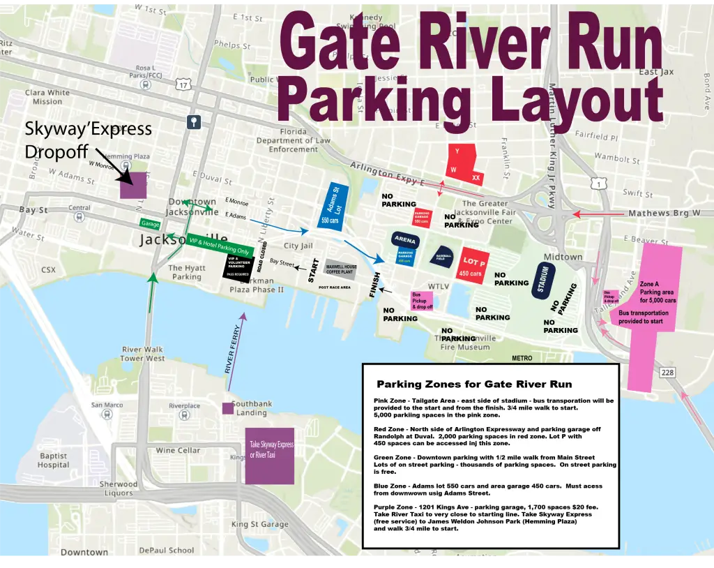 Parking for the Gate River Run is available in multiple designated lots and garages throughout Downtown Jacksonville and near the Sports Complex.