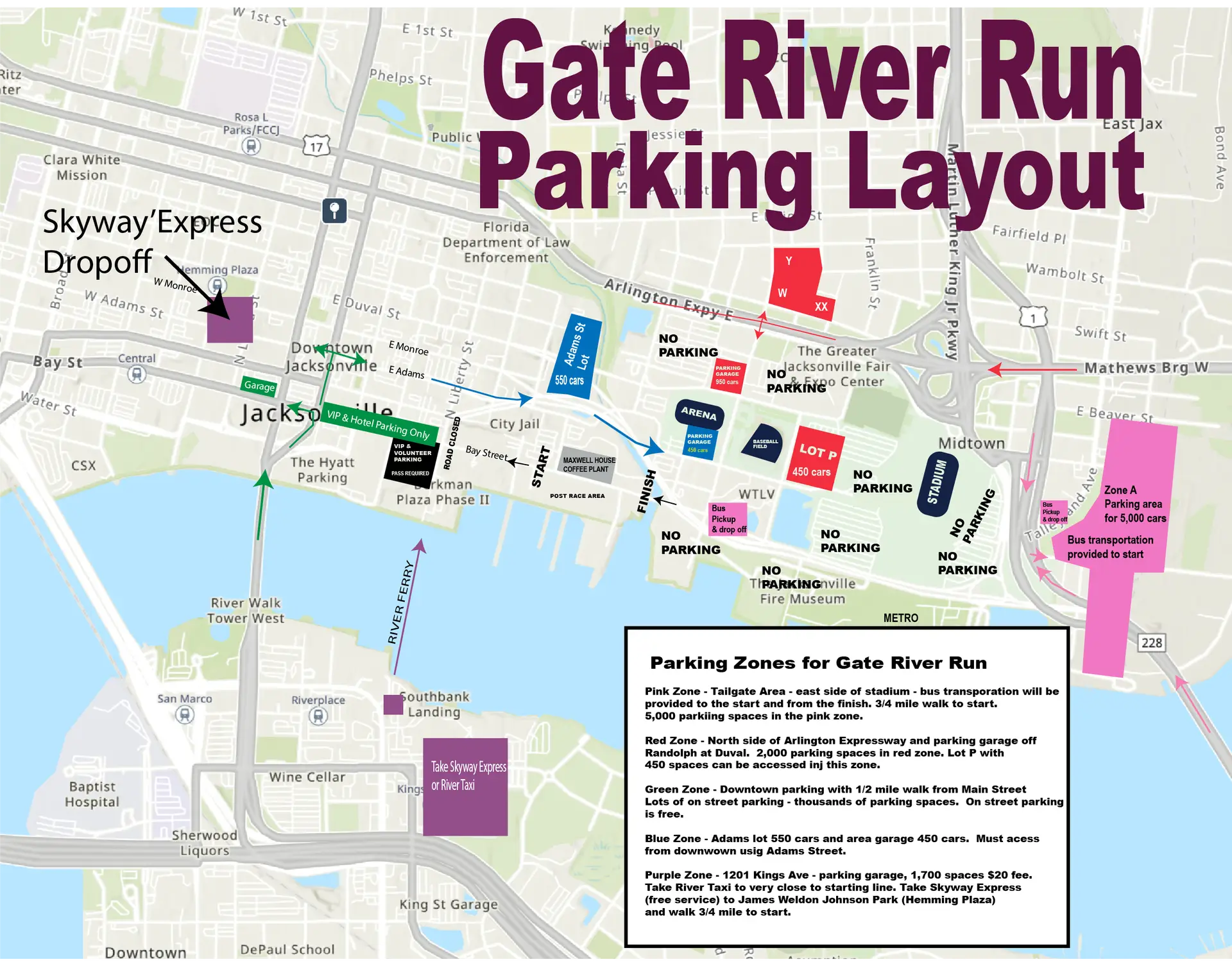 Parking for the Gate River Run is available in multiple designated lots and garages throughout Downtown Jacksonville and near the Sports Complex.